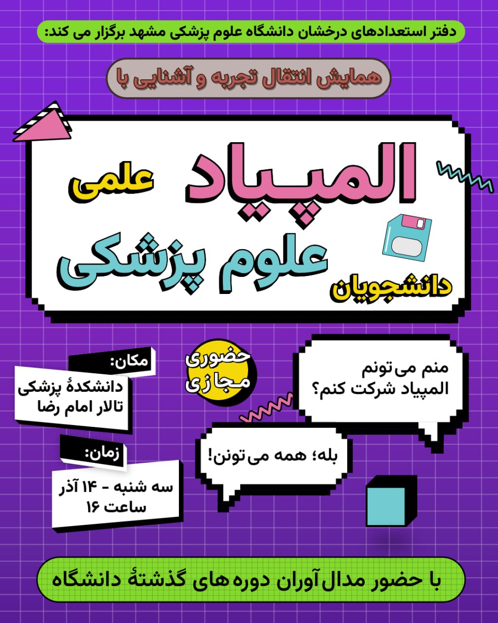 واحد استعداد درخشان دانشگاه علوم پزشکی مشهد در نظر دارد تا در روز سه شنبه مورخ 14/09/1402 از ساعت 16 همایشی با عنوان " انتقال تجربه و آشنایی با حیطه های المپیاد شانزدهمین دوره المپیادهای علمی دانشجویان علوم پزشکی "در دانشکده پزشکی سالن امام رضا (ع) برگزار نماید لذا از تمام علاقه مندان دعوت میشود تا در صورت تمایل در این مراسم حضور داشته باشند.